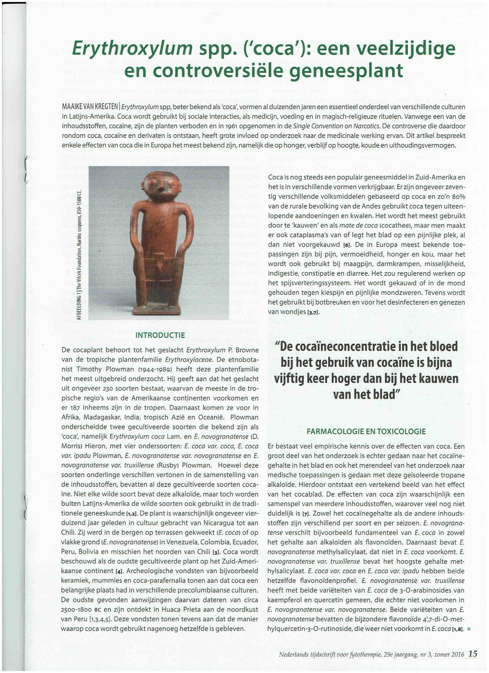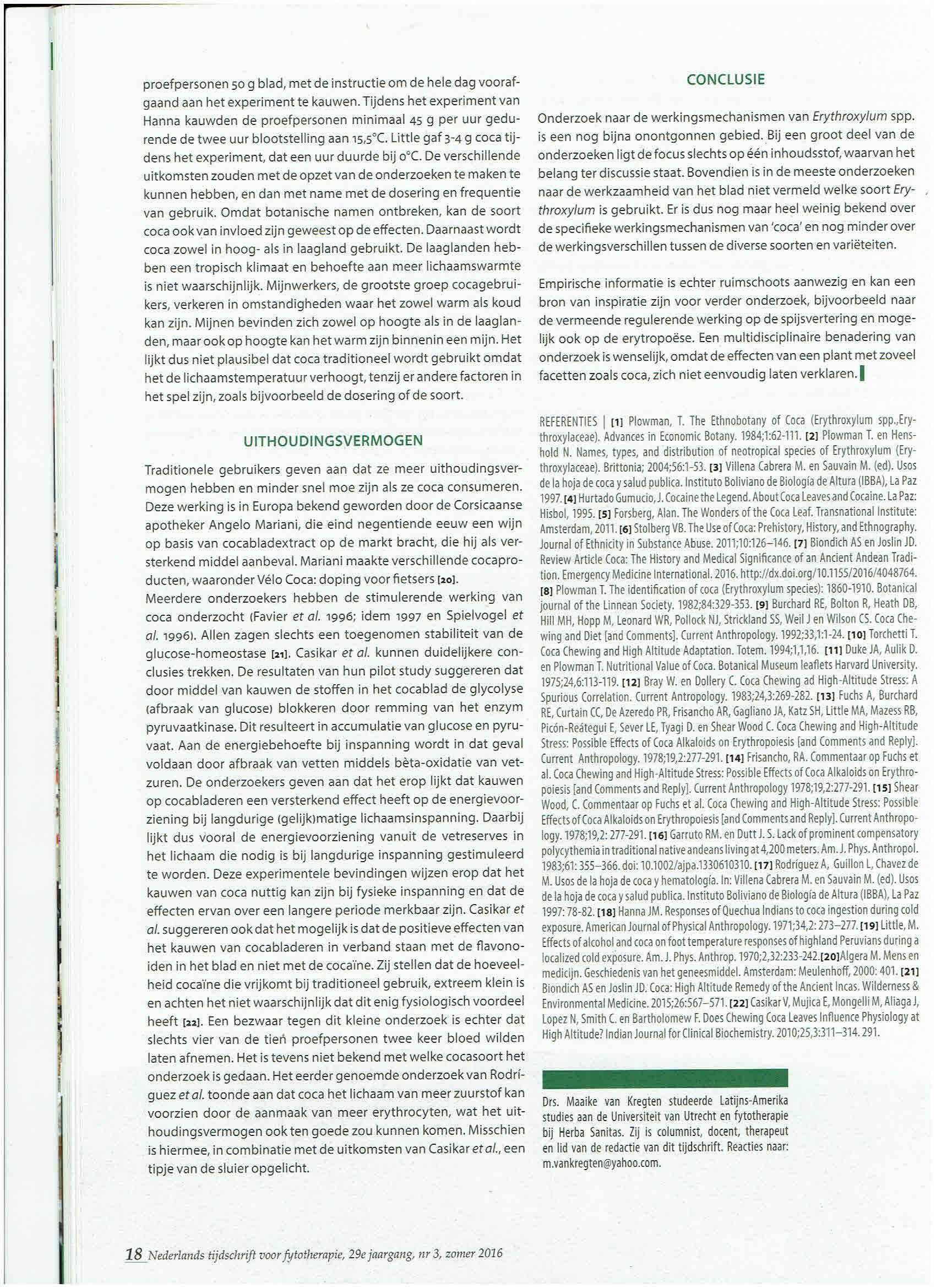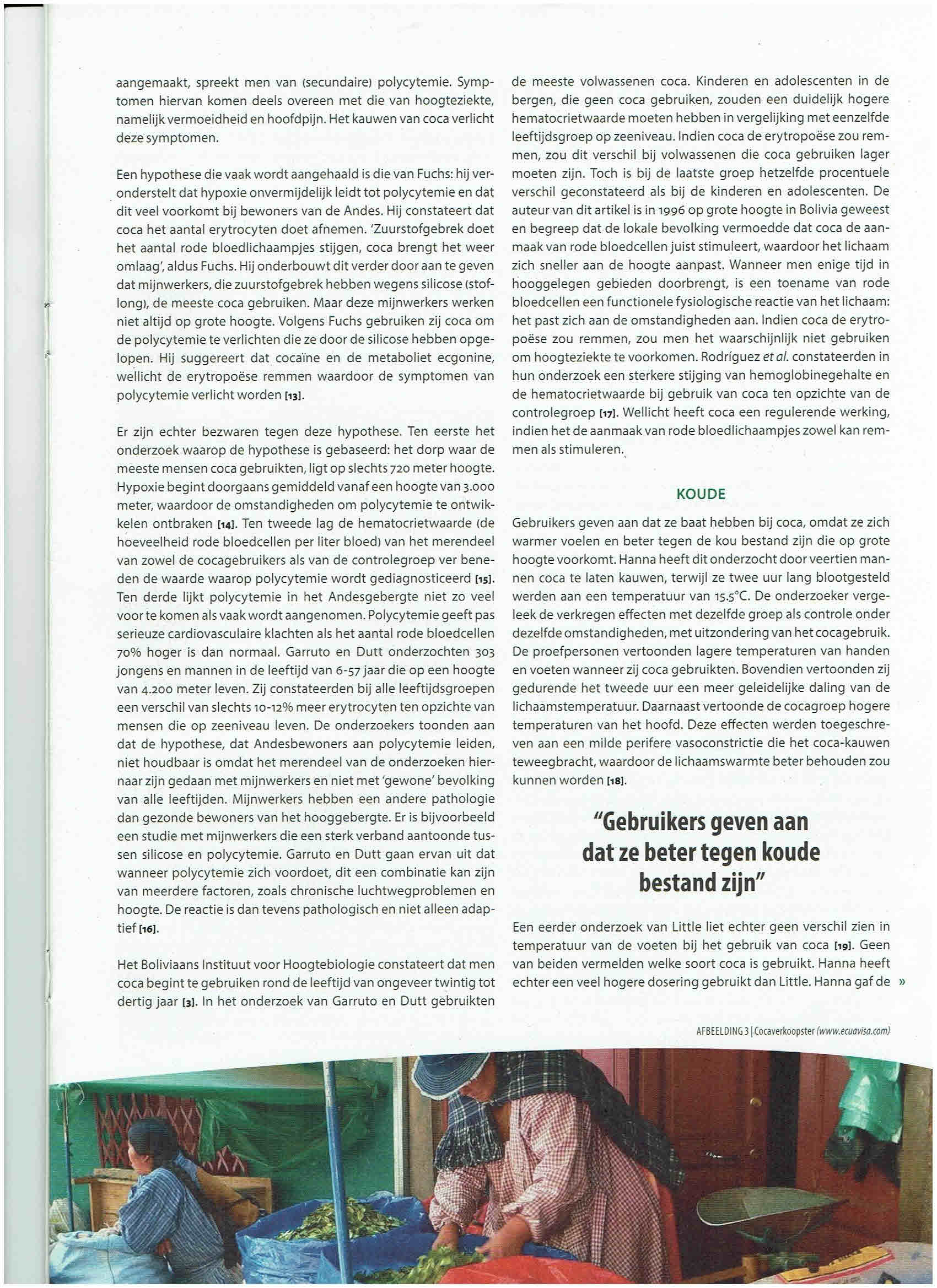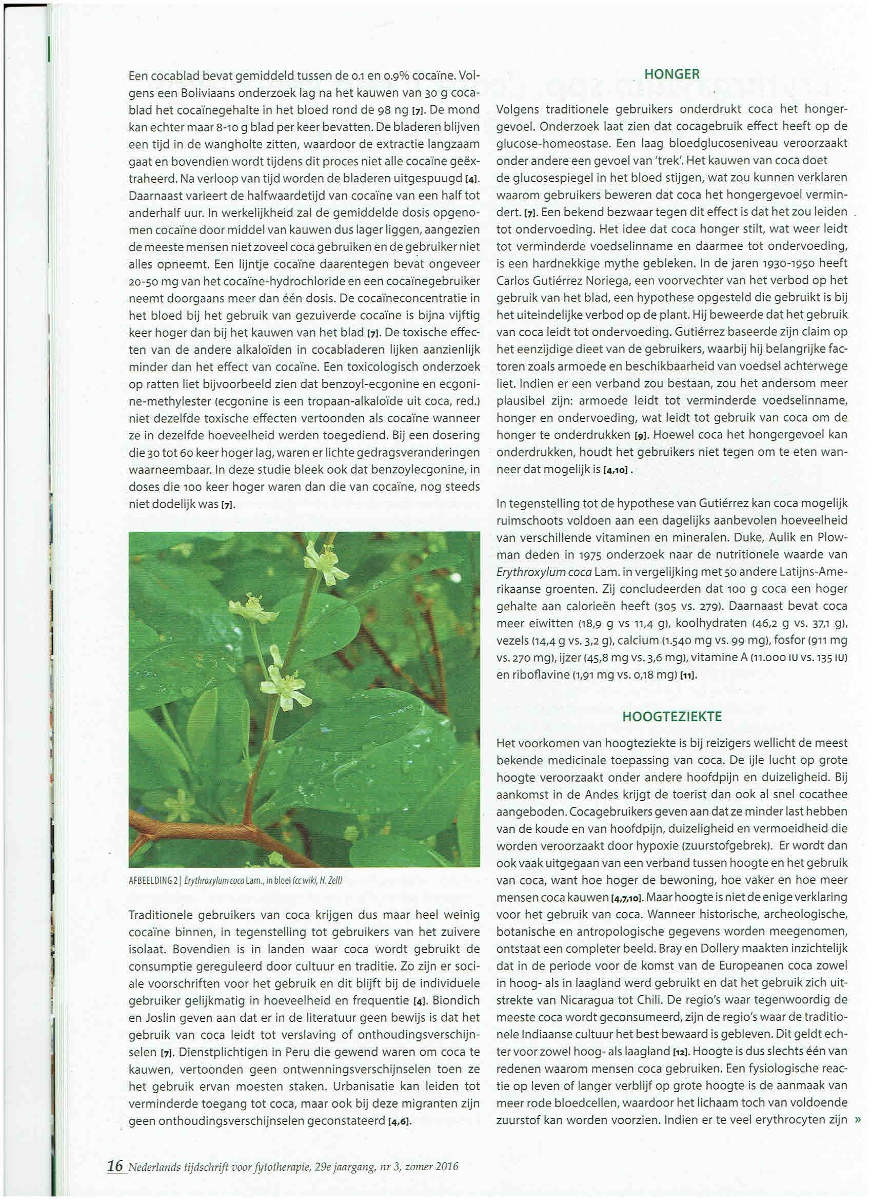 REFERENTIES | [1] Plowman, T. The Ethnobotany of Coca (Erythroxylum spp.,Erythroxylaceae). Advances in Economic Botany. 1984;1:62-111. [2] Plowman T. en Henshold N. Names, types, and distribution of neotropical species of Erythroxylum (Erythroxylaceae). Brittonia; 2004;56:1-53. [3] Villena Cabrera M. en Sauvain M. (ed). Usos de la hoja de coca y salud publica. Instituto Boliviano de Biologia de Altura (IBBA), La Paz 1997. [4] Hurtado Gumucio, J. Cocaïne the Legend. About Coca Leaves and Cocaïne. La Paz: Hisbol, 1995. [5] Forsberg, Alan. The Wonders of the Coca Leaf. Transnational Institute: Amsterdam, 2011. [6] Stolberg VB. The Use of Coca: Prehistory, History, and Ethnography. Journal of Ethnicity in Substance Abuse. 2011; 10:126–146. [7] Biondich AS en Joslin JD. Review Article Coca: The History and Medical Significance of an Ancient Andean Tradition. Emergency Medicine International. 2016. http://dx.doi.org/10.1155/2016/4048764. [8] Plowman T. The identification of coca (Erythroxylum species): 1860-1910. Botanical journal of the Linnean Society. 1982;84:329-353. [9] Burchard RE, Bolton R, Heath DB, Hill MH, Hopp M, Leonard WR, Pollock NJ, Strickland SS, Weil J en Wilson CS. Coca Chewing and Diet [and Comments]. Current Anthropology. 1992;33,1:1-24. [10] Torchetti T. Coca Chewing and High Altitude Adaptation. Totem. 1994;1,1,16. [11] Duke JA, Aulik D. en Plowman T. Nutritional Value of Coca. Botanical Museum leaflets Harvard University. 1975;24,6:113-119. [12] Bray W. en Dollery C. Coca Chewing ad High-Altitude Stress: A Spurious Correlation. Current Antropology. 1983;24,3:269-282. [13] Fuchs A, Burchard RE, Curtain CC, De Azeredo PR, Frisancho AR, Gagliano JA, Katz SH, Little MA, Mazess RB, Picon-Reategui E, Sever LE, Tyagi D. en Shear Wood C. Coca Chewing and High-Altitude Stress: Possible Effects of Coca Alkaloids on Erythropoiesis [and Comments and Reply]. Current Anthropology. 1978;19,2:277-291. [14] Frisancho, RA. Commentaar op Fuchs et al. Coca Chewing and High-Altitude Stress: Possible Effects of Coca Alkaloids on Erythropoiesis [and Comments and Reply]. Current Anthropology 1978;19,2:277-291. [15] Shear Wood, C. Commentaar op Fuchs et al. Coca Chewing and High-Altitude Stress: Possible Effects of Coca Alkaloids on Erythropoiesis [and Comments and Reply]. Current Anthropology. 1978;19,2: 277-291. [16] Garruto RM. en Dutt J. S. Lack of prominent compensatory polycythemia in traditional native andeans living at 4,200 meters. Am. J. Phys. Anthropol. 1983;61: 355–366. doi: 10.1002/ajpa.1330610310. [17] Rodriguez A, Guillon L, Chavez de M. Usos de la hoja de coca y hematologia. In: Villena Cabrera M. en Sauvain M. (ed). Usos de la hoja de coca y salud publica. Instituto Boliviano de Biologia de Altura (IBBA), La Paz 1997: 78-82. [18] Hanna JM. Responses of Quechua Indians to coca ingestion during cold exposure. American Journal of Physical Anthropology. 1971;34,2: 273–277. [19] Little, M. Effects of alcohol and coca on foot temperature responses of highland Peruvians during a localized cold exposure. Am. J. Phys. Anthrop. 1970;2,32:233-242.[20]Algera M. Mens en medicijn. Geschiedenis van het geneesmiddel. Amsterdam: Meulenhoff, 2000: 401. [21] Biondich AS en Joslin JD. Coca: High Altitude Remedy of the Ancient Incas. Wilderness & Environmental Medicine. 2015;26:567–571. [22] Casikar V, Mujica E, Mongelli M, Aliaga J, Lopez N, Smith C. en Bartholomew F. Does Chewing Coca Leaves Influence Physiology at High Altitude? Indian Journal for Clinical Biochemistry. 2010;25,3:311–314. 291.